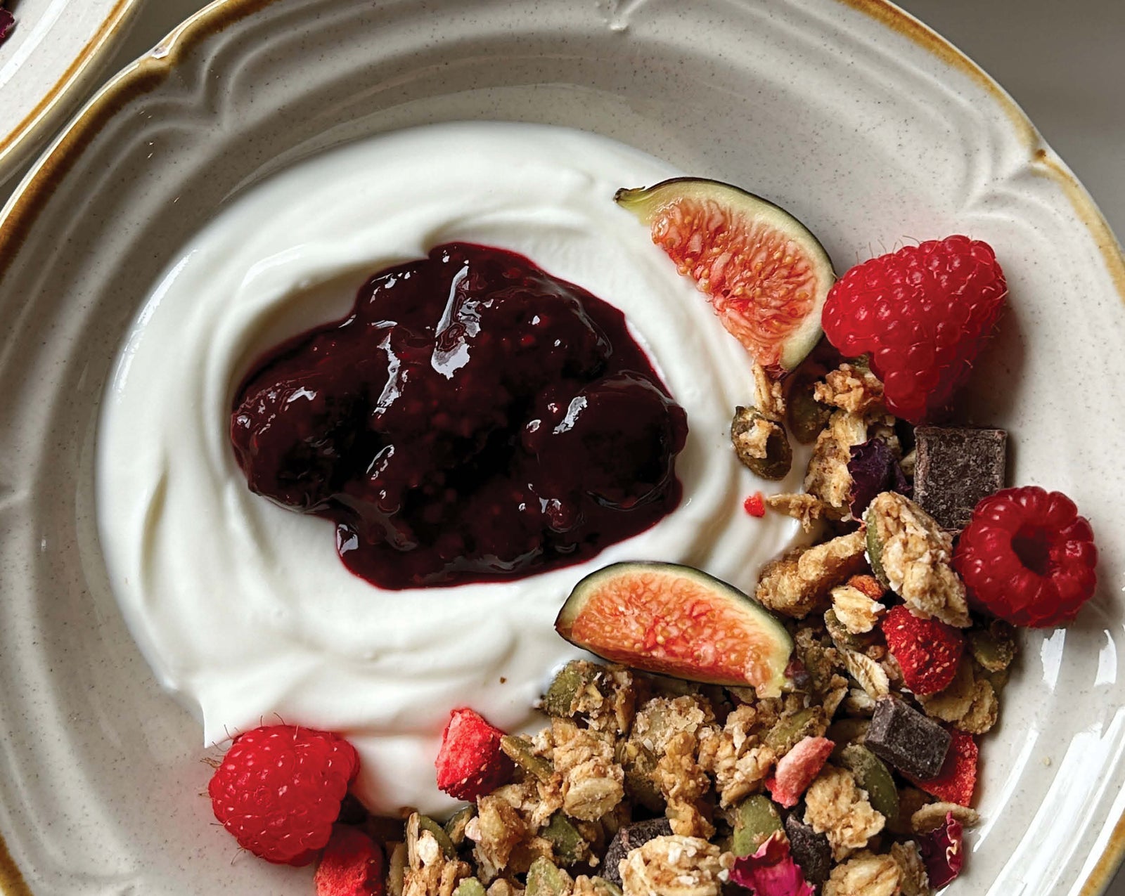 - Une fois le granola refroidi, ajoutez les fraises, le chocolat et les pétales de rose. Servez avec le yaourt de votre choix et des fruits frais ou une compote de fruits. Bon appétit !