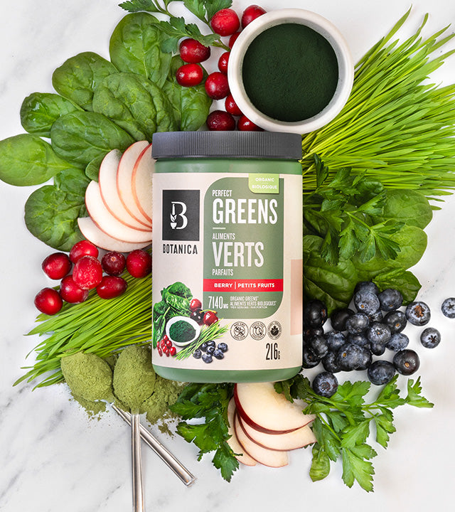 Botanica Perfect Greens est un mélange de poudre de légumes verts biologiques hautement concentré au goût de baies, composé de chlorella, de spiruline et de légumes verts à feuilles, pour vous aider à obtenir vos légumes verts quotidiens.