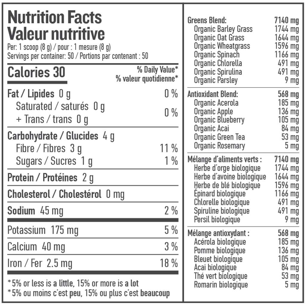 Les feuilles de blé, ou herbe, ne contiennent pas de gluten. Le gluten se trouve dans la baie (le grain). Tous les ingrédients de nos Perfect Greens, ainsi que le produit fini, sont testés pour la présence de gluten. Tous les lots doivent contenir moins de 20 parties par million de gluten pour être déclarés sans gluten selon les exigences de Santé Canada. L'usine où le produit est fabriqué ne travaille pas avec du gluten, mais il est important de noter qu'en raison de la nature agricole des ingrédients, ce produit présente un risque plus élevé de contamination par le gluten. Les principales préoccupations concernent l'herbe de blé, l'herbe d'orge et l'herbe d'avoine chez le fournisseur d'ingrédients (si le camion de livraison transporte également des grains d'orge, par exemple). Ainsi, même si nous testons et garantissons que le produit contient moins de 20 parties par million de gluten, il en contient très probablement de très petites quantités. Par conséquent, si vous êtes allergique au gluten, nous vous recommandons de ne pas consommer nos Perfect Greens.